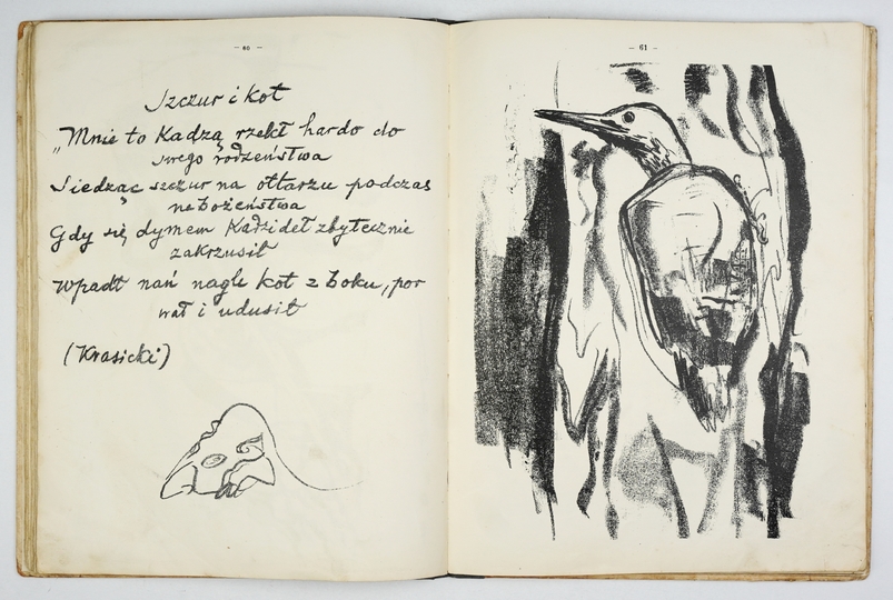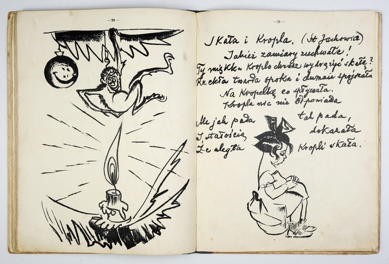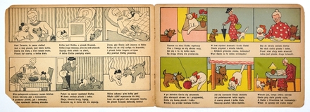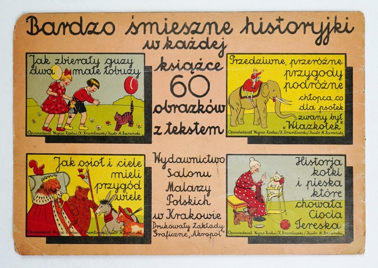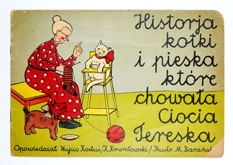 KRUMŁOWSKI K[onstanty] – Historja kotki i pieska, które chowała Ciocia Tereska. Opowiedział Wujcio Kostuś (...). Ilustr. M. Barański. Kraków [1938]. Wydawnictwo Salonu Malarzy Polskich. Druk. Zakł. Graficzne "Akropol". 16d podł., s. [8]. brosz. Bardzo Śmieszne Historyjki.
