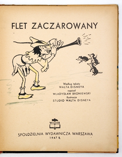 DISNEY Walt – Flet zaczarowany. Według tekstu ... napisał Władysław Broniewski. Ilustracje Studio Walta Disneya. Warszawa 1947. Spółdz. Wydawn. Wiedza. 8, s. 70, [2]. opr. oryg. kart., obw.