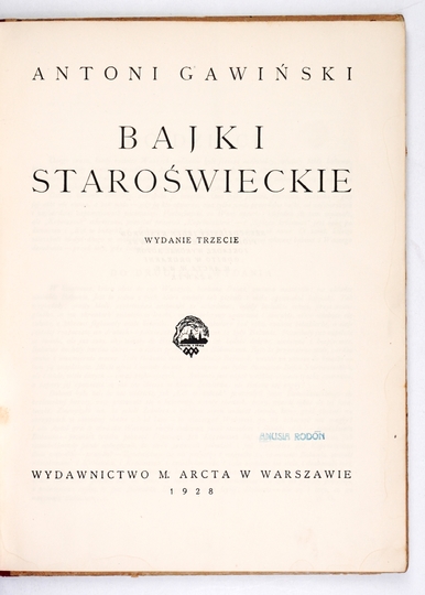 GAWIŃSKI Antoni – Bajki staroświeckie. Wyd. III. Warszawa 1928. M. Arct. 4, s. 101, [2], tabl. barwne 3. opr. oryg. ppł.