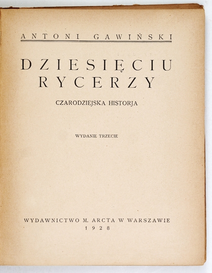 GAWIŃSKI Antoni – Dziesięciu rycerzy. Czarodziejska historja. Wyd. III. Warszawa 1928. M. Arct. 8, s. 182, [2], tabl. barwne 3. opr. oryg. ppł.