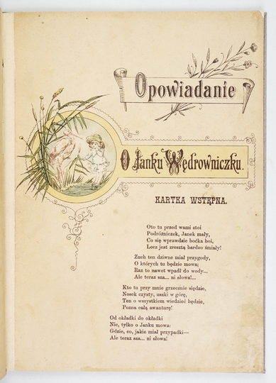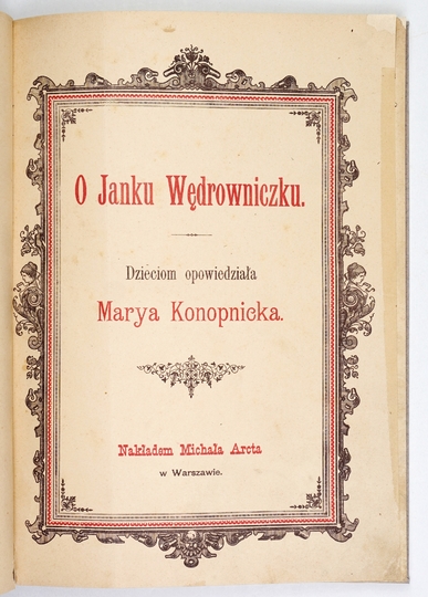KONOPNICKA Marya – O Janku Wędrowniczku. Dzieciom opowiedziała ... Warszawa [1893]. M. Arct. 4, k. [14]. opr. wsp. kart, okł. brosz. naklejona na oprawę.