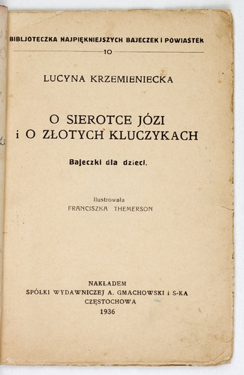 KRZEMIENIECKA Lucyna – O sierotce Józi i o złotych kluczykach. Bajeczki dla dzieci. Ilustrowała Franciszka Themerson. Częstochowa 1936. A.Gmachowski i S-ka. 16d, s. 32. brosz. Bibljoteczka Najpiękniejszych Bajeczek i Powiastek, nr 10.
