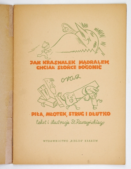 RACZYŃSKI St[anisław] – Jak krasnalek Mądralek chciał słońce dogonić oraz Piła, młotek, strug i dłutko. Tekst i ilustr. ... Kraków [1946]. Wyd. "Biblos". 4, s. [16]. brosz.
