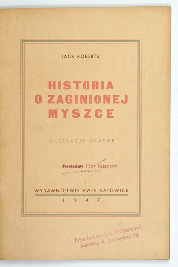 ROBERTS Jack – Historia o zaginionej myszce. Ilustr. własne. Katowice 1947. Wyd. AWiR. 8, s. [32]. brosz.