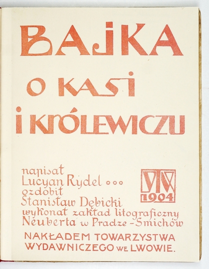 RYDEL Lucjan – Bajka o Kasi i królewiczu. Ozdobił Stanisław Dębicki. Wykonał zakład litograficzny Neuberta w Pradze-Smichów. Lwów 1904. Nakł. Tow. Wydawn. 4, s. [62]. opr. oryg. ppł.