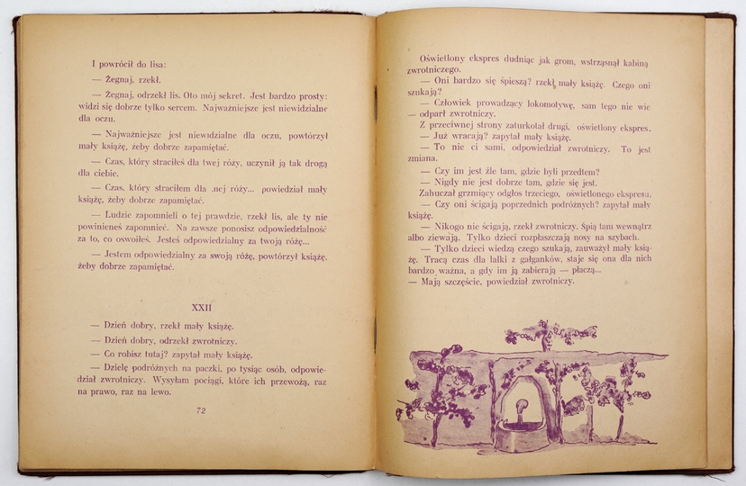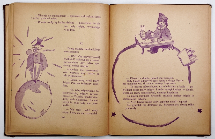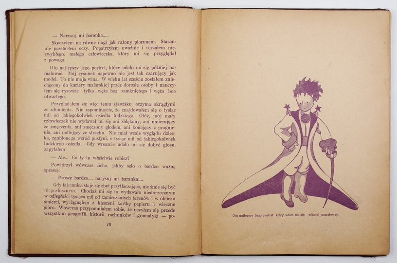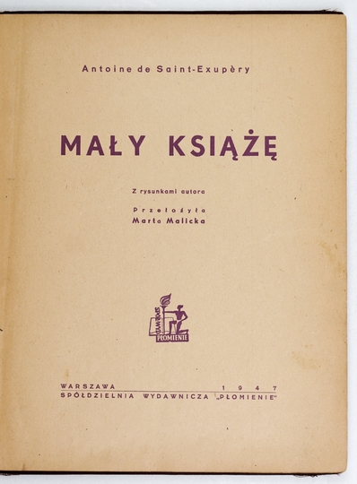 SAINT-EXUPERY Antoine de – Mały Książę. Z rysunkami autora. Przełożyła Marta Malicka. Warszawa 1947. Spółdzielnia Wyd. "Płomienie". 8, s. 91, [2]. opr. oryg. pł.