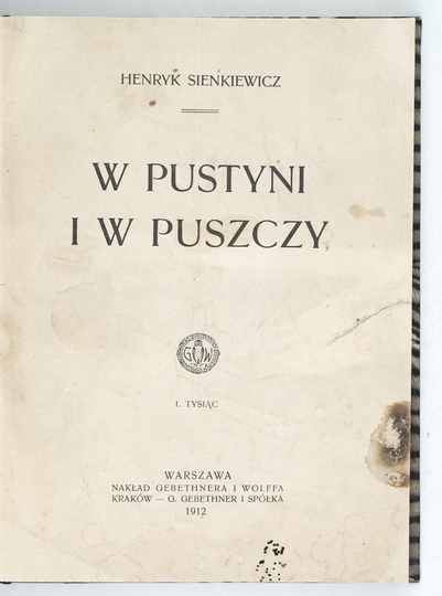 SIENKIEWICZ Henryk – W pustyni i w puszczy. Warszawa 1912 [właśc. 1911]. Nakł. Gebethnera i Wolffa. 8, s. [2], 395. opr. wsp. ppł.
