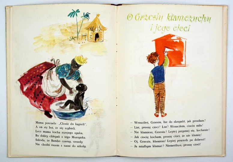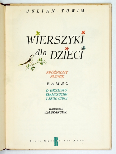 TUWIM Julian – Wierszyki dla dzieci. Spóźniony słowik, Bambo, O Grzesiu kłamczuchu i jego cioci. Ilustrował J[an] M[arcin] Szancer. Warszawa 1962. Biuro Wyd. "Ruch". 4, s. [16]. opr. oryg. ppł.