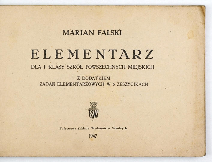 FALSKI Marian – Elementarz dla I klasy szkół powszechnych miejskich. Z dodatkiem zadań elementarzowych [...]. [Warszawa] 1947. Państw. Zakłady Wydawnictw Szkolnych. 16 podł., s. 160. brosz.