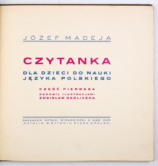 MADEJA Józef – Czytanka dla dzieci do nauki języka polskiego. Cz. 1. Ozdobił ilustracjami Zdzisław Gedliczka. Bytom [1929]. Spółka Wydawnicza "Katolik". 8, s. 114. opr. oryg. ppł.