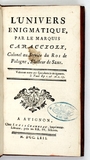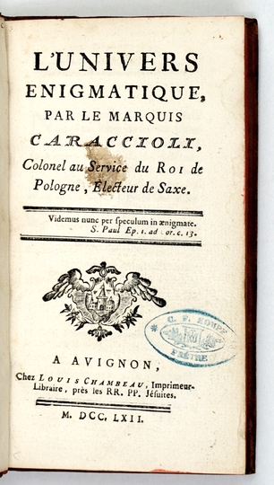 CARACCIOLI [Ludwik Antoni] – L' univers énigmatique par le marquis ... Colonel au Service du Roi de Pologne, Electeur de Saxe. A Avignon 1762. Chez Louis Chambeau. 8, s. XXVI, 109. opr. skóra złoc. z epoki, obcięcie barwione.