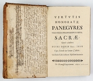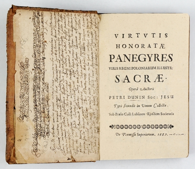 DUNIN Piotr Stanisław – Virtvtis honoratae panegyres Viris Regni Poloniarum Illvstr. Sacrae. Opera auctoris Petri Dunin Soc: Jesu Typis secundis in vnum Collectae. Lublin 1687. Sub praelo Coll: Lublinen: ejusdem Societatis. 8, s. [28], 308 [jest mylnie 988], [7]. opr. nieco późn.? skóra.
