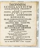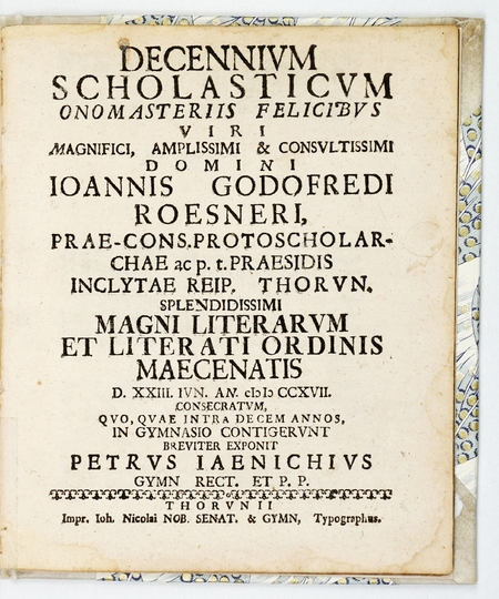 JAENICHEN Peter – Decennivm Scholasticvm onomasteriis felicibvs viri Magnifici [...] Domini Ioannis Godofredi Roesneri [...]. Thorvnii 1717. Impr. Ioh. Nicolai. 4, s. [12]. opr. wsp. pperg.