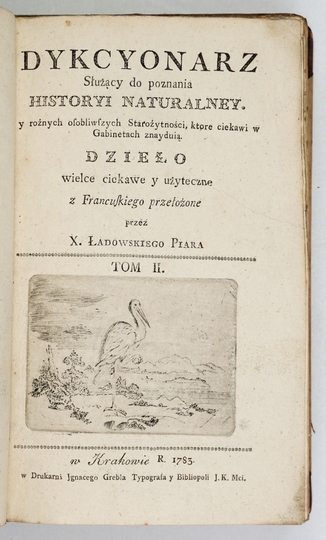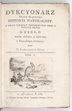 [MONTLINOT Antoni Leclerc de] – Dykcyonarz Służący do poznania Historyi Naturalney y różnych osobliwszych Starożytności, które ciekawi w Gabinetach znaydują. Dzieło wielce ciekawe y użyteczne z Francuskiego przełozone przez X. Ładowskiego Piara. T. 1-2. W Krakowie 1783. W Drukarni Ignacego Grebla Typografa y Bibliopoli J. K. Mci. 8, s. [14], 391; [4], 412, [30]. opr. XX-w. psk. złoc. z zach. okł. brosz.