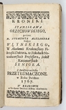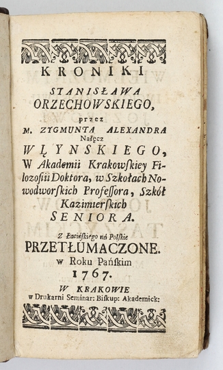 ORZECHOWSKI Stanisław – Kroniki Stanisława Orzechowskiego przez M. Zygmunta Alexandra Nałęcz Włyńskiego, w Akademii Krakowskiej Filozofii Doktora, w Szkołach Nowodworskich Professora, Szkół Kazimierskich Seniora. Z Łacińskiego na Polskie przetłumaczone. W Krakowie 1767. W Drukarni Seminar. Biskup. Akademick. 8, s. [12], 281, [12]. opr. psk. z epoki.