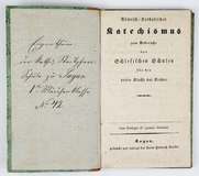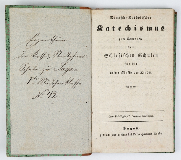 RÖMISCH-KATHOLISCHER Katechismus zum Gebrauche der Schlesischen Schulen für die dritte Klasse der Kinder. Sagan [= Żagań] [po 1797]. Gedruckt und verlegt bei Peter Heinrich Raabe. 8, s. 227, [5]. opr. psk. z epoki.