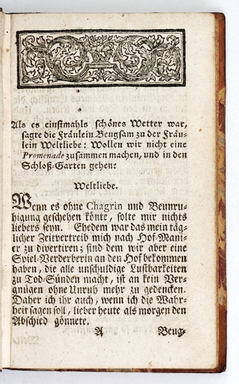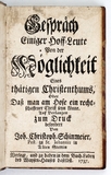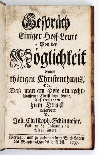 SCHINMEYER Johann Christoph – Gespräch Einiger Hoff-Leute Von der Möglichkeit Eines thätigen Christenthums, Oder Dass man am Hofe ein recht-schaffener Christ seyn könne. Auf Verlangen zum Druck befordert Von Joh. Christoph. Schinmeier, Past. zu St. Johannis in Alten-Stettin. [Stettin] 1737. Verlegt, und zu haben in dem Buch-Laden des Waysen-Hauses daselbst. 8, s. [8], 84