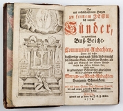 SCHMOLCK Benjamin – Der mit rechtschaffenem Herzen zu seinem Jesu sich nahende Sünder, in auserlesenen Buss- Beicht- und Communion-Andachten, Deren sich dessen bussfertige und nach Jesu Liebesmahl sich sehnende Seele, sowohl zur Beichte, als auch zum Gebrauch des theuren Abendmahls des Herrn bedienen kan; Benebst denen in gebundener Schreib-Art abgefassten Gott-geheiligten alltäglichen Morgen- und Abend-Andachten, Benjamin Schmolckens. Neue, und mit denen Sieben Buss-Psalmen Davids wie auch einigen geistreichen Gebeten und Liedern vermehrtere Auflage. Danzig 1778. Gedruckt und zu finden bey J. E. F. Müller. 8, s. [14], 272, frontispis w miedziorycie. opr. skóra z epoki, obcięcie złoc.