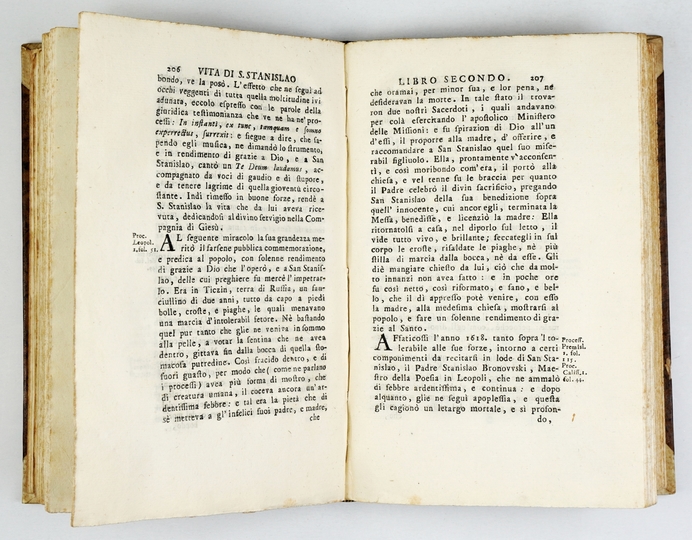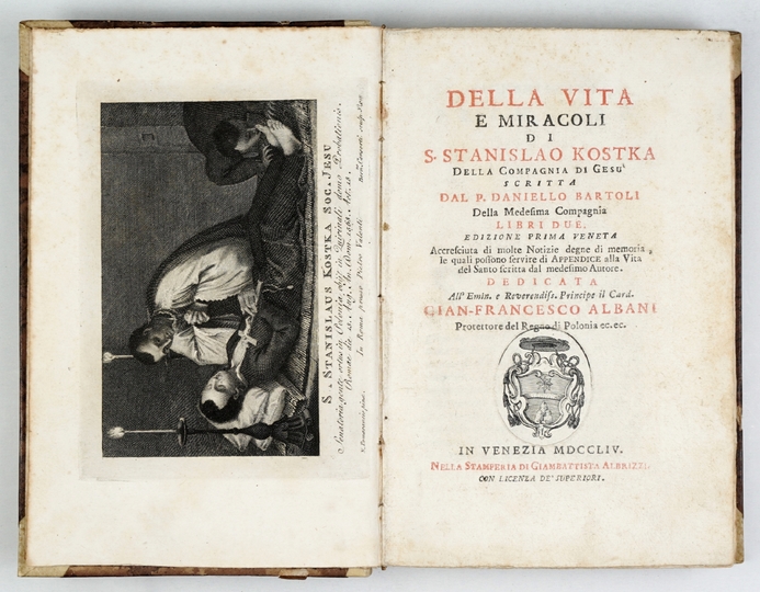 BARTOLI Daniello P. – Della vita e miracoli d i [del Beato] S. Stanislao Kostka. Della Compagnia di Gesu scritta dal ... Libri due. Editione prima veneta. Accresciuta di molte Notize degne do memoria, le quali possono servire di Appendice alla Vita del Santo scritta dal medesimo Autore. Dedicata all'Emin[en] e Reverendiss. Principe il Card. Gian-Erancesco Albani Protettore del Regno di Polonia etc. etc. In Venezia 1754. Nella Stamperia di G. Albrizzi. 8, s. [12], 402, [2], tabl. 1 [miedzioryt]. opr. oryg. perg. złoc., z szyldzikiem.