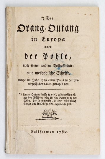 [BENKOWITZ Carl Friedrich] – Der Orang-Outang in Europa oder der Pohle, nach seiner wahren Beschaffenheit; eine methodische Schrift, welche im Jahre 1779 einen Preis in der Naturgeschichte davon getragen hat. Californien [właśc. Berlin] 1780. [J. Pauli]. 8, s. 94. brosz.