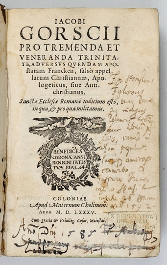 GÓRSKI Jakub – Pro tremenda et veneranda Trinitate, adversvs quendam Apostatam Francken, falso appellatum Christianum, Apologeticus, siue Antichristianus. Sanctae Ecclesiae Romanae iudicium esto, in qua, & pro qua militamus. Coloniae 1585. Apud Maternum Cholinum. 8, s. [64], 414. opr. perg. z epoki.