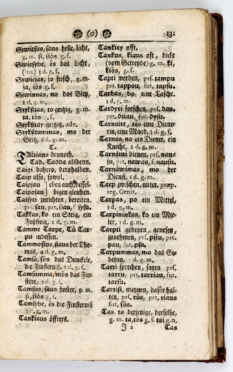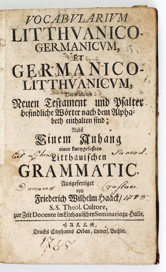 HAACK Friedrich Wilhelm – Vocabvlarivm litthvanico-germanicum, et germanico-litthvanicvm, Darin alle im Neuen Testament und Psalter befindliche Wörter nach dem Alphabeth enthalten sind; Nebst Einem Anhang einer kurzgefassten Litthauischen Grammatic. Halle [1730]. Druckts Stephanus Orban, Univers. Buchdr. 8, s. [6], 332. opr. psk. z epoki.