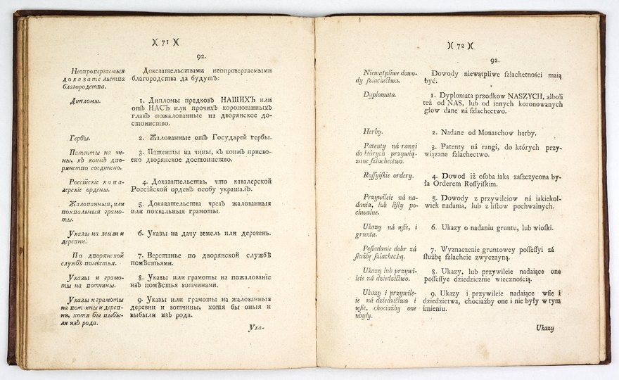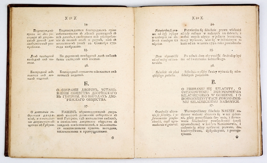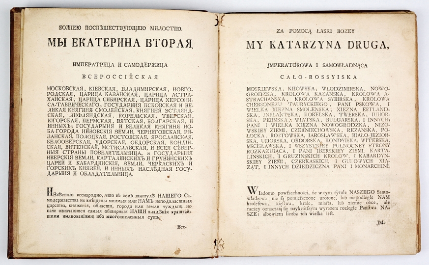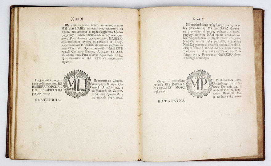 KATARZYNA II – O dvorjanstve. O szlachectwie. Sankt-Petersburg-Moskwa, 24 IV 1785, 20 V 1785. Druk przy Senacie (Sankt-Peterburg), Druk. Senacka (Moskwa). 4, s. [15], 94. opr. skóra z epoki.