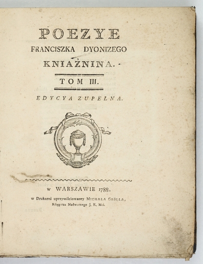 KNIAŹNIN Franciszek Dyonizy – Poezye. Edycya zupełna. T. 3. W Warszawie 1788. W Drukarni uprzywieiowaney Michała Grölla. 4, s. [4], 264, [3]. opr. XX w. pperg. złoc., górne obcięcie barwione.