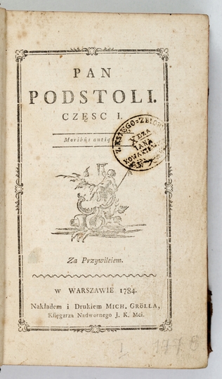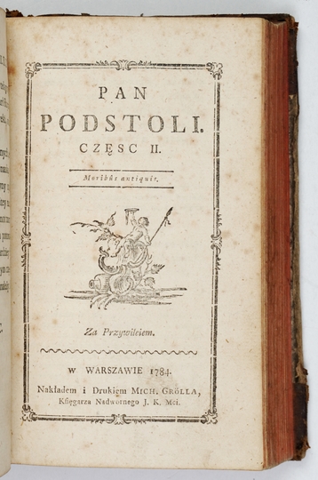 [KRASICKI Ignacy] – Pan Podstoli. Cz. 1-2. W Warszawie 1784. Nakładem i Drukiem Mich. Grölla [...]. 8, s. [6], 300; 279. razem opr. psk. z epoki.