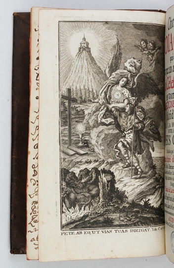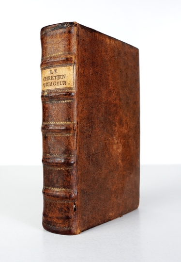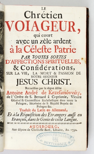 KRZESIMOWSKI Antoni Andrzej – Le Chrétien Voiageur qui court avec un zèle ardent à la Céleste Patrie par toutes sortes d 'affections spirituelles, & Considérations sur la vie, la mort & passion de notre Seigneur Jesus Christ [...]. Traduit du Latin en Allemand [...]. Augsbourg 1752. Aux dépens de Christofle Bartl, Libraire. 8, s. [10], 522, [4], frontispis w miedziorycie. opr. skóra z epoki, obcięcie barwione.