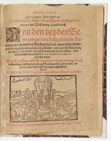 NAGEL Paul – Prodromus Astronomiae Apocalypticae, Welcher uns fürstellet, die gewisse warhafftige fundament der Weissagung: Handelt auch von den beyden Bewegungen des hellgestirnten Firmaments, so wol des Kirchen Him[m]els, was solche seynd, wenn sie angehen, wie weit sie sich erstrecken, und was für Bedeutung und Wunder im Him[m]el und auff Erden solche mit sich führen: Und insonderheit wenn sich der Leo Rugiens cap. 10 einstellen werde. Allen Menschen auff Erden zu guter Nachrichtung, hoch nothwendig zu wissen, und also auss Apocalyptischer Astronomia deducirt, mit fleiss beschrieben und aussgeführet. Dantzig 1620. Gedruckt bey Martin Rode. 4, s. opr. wsp. pperg.