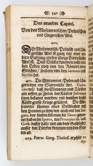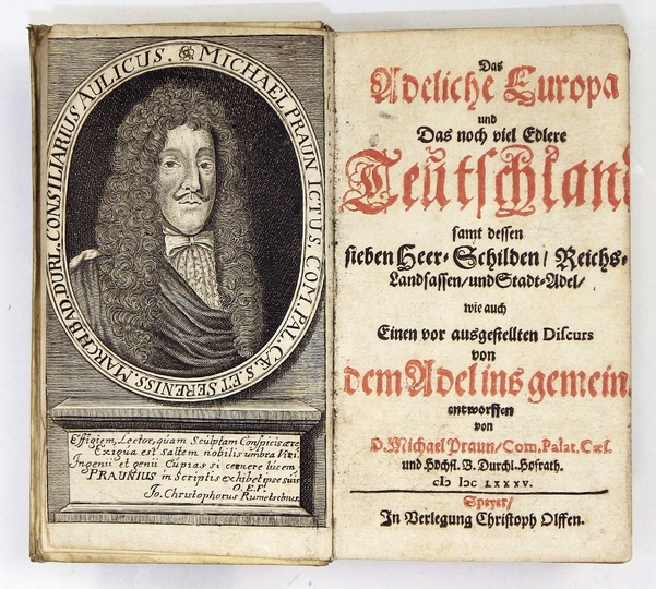 PRAUN Michael – Das Adeliche Europa und Das noch viel Edlere Teutschland samt dessen sieben Heer-Schilden, Reichs-Landsassen, und Stadt-Adel, wie auch Einen vor ausgestellten Discurs von dem Adel ins gemein, entworffen von D. Michael Praun, Com. Palat. Caes. und Hochfl. B. Durchl. Hofrath. Speyer 1685. In Verlegung Christoph Olffen. 8, s. [30], 880, LXXIX, tabl. 1. opr. perg. z epoki.