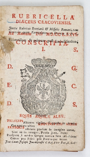 RUBRICELLA Diaecesis Cracoviensis. Juxta Rubricas Breviarii & Missalis Romani, tam Generales quam Particulares ac Decreta S. R. C. Ad Annum D[omi]ni MD.CCL.XXVI. Bissextilem & primum post Embolismalem conscripta [...]. [b.m.] 1776. 8, s. [96]. opr. nieco późn. kart.