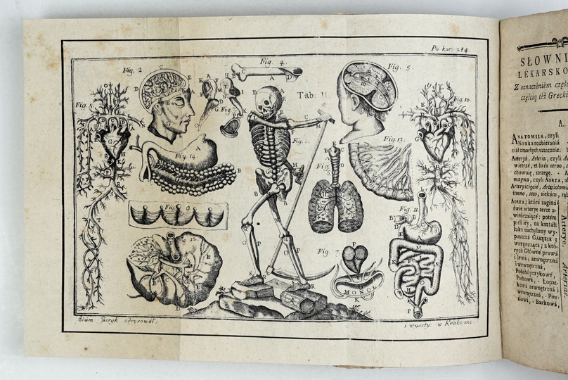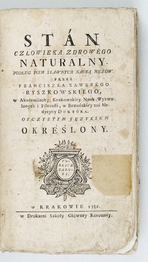 RYSZKOWSKI Franciszek Xawery – Stan człowieka zdrowego naturalny. Podług pism sławnych nauką mężów [...] oyczystym ięzykiem określony. W Krakowie 1786. W Drukarni Szkoły Główney Koronney. 8, s. VI, [2], 326, tabl. 2. opr. psk. z epoki.