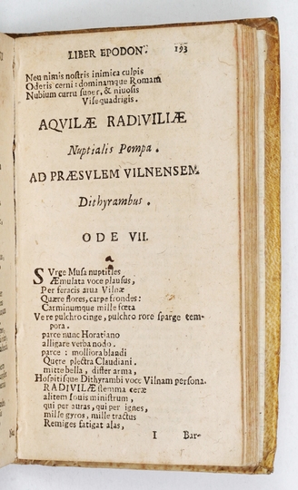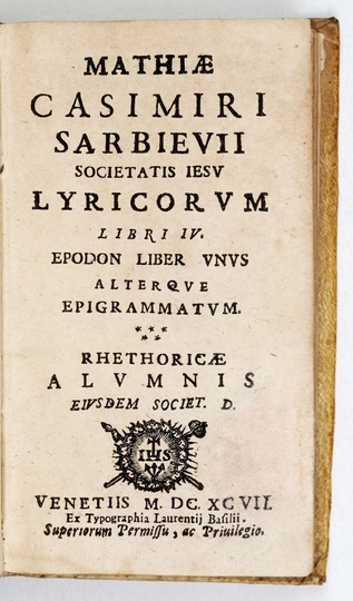 SARBIEWSKI Michał Kazimierz – Lyricorvm libri IV. Epodon liber vnvs alterque epigrammatvm. Rhetoricae alvmnis eivsdem Societ. D. Venetiis 1697. Ex Typographia Laurentij Basilii. 8, s. 299. opr. perg. z epoki.