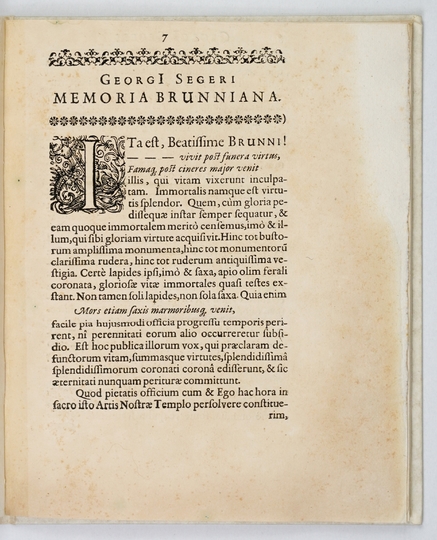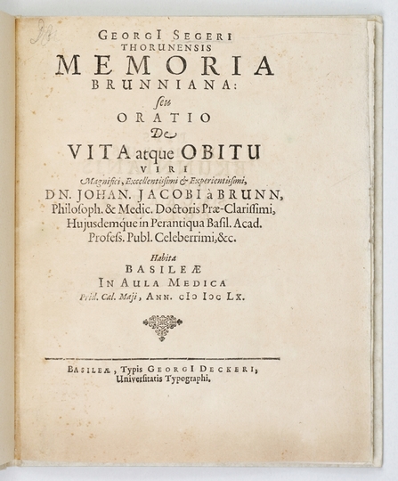 SEGER Georg – Georgi Segeri Thorunensis Memoria Brunniana: seu oratio De vita atque obitu Viri Magnifici [...] Dn. Johan. Jacobi a Brunn, Philosoph. & Medic. Doctoris [...]. Habita Basileae in Aula Medica Prid. Cal. Basileae 1660. Typis Georgi Deckeri, Universitatis Typographi. 4, s. 48. opr. wsp. perg.