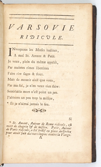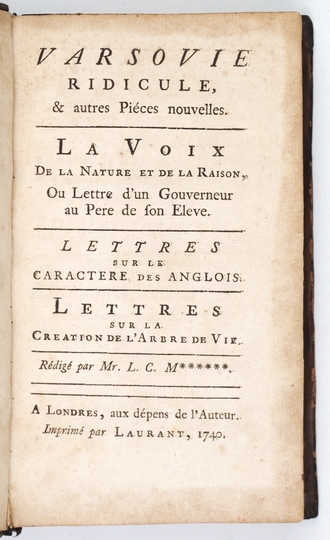 VARSOVIE ridicule, & autres Piéces nouvelles. La Voix De la Nature et de a Raison, Ou Lettre d'un Gouverneur au Pere de son Eleve. Lettres sur le Caractere des Anglois. Lettres sur la Creation de l'Arbre de Vie. Rédigé par Mr. L. C. M******. A Londres [właśc. Amsterdam?] 1740. Aux dépens de l'Auteur. Imprimé par Laurant. 8, s. [4], 192, 110, 4, [1]. opr. skóra z epoki, obcięcie barwione.