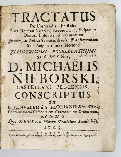 [WYSOCKI] Samuel – Tractatus De Formandis Epistolis Iuxta Normam Veterum, Recentiorumq: Scriptorum Oratori Polono in supplementum [...] Sub Auspicatissimo Nomine [...] Michaelis Nieborski, Castellani Plocensis, conscritpus per P. Samuelem a S. Floriano Schol: Piaru[m]. Cracoviae 1743. Typis M. J. Dyaszewski. 4, s. [12], 608, [20], tabl. rozkł. 2. opr. skóra z epoki.