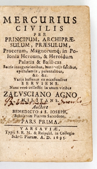 [ZAWADZKI] Benedicto a s. Joseph – Mercurius Civilis per Principum, Archipraesulum, Praesulum, Procerum, Magnorumq́; que in Polonia Heroum, & Heroidum Palatia & Basilicas Sacris inaugurationibus, honorarijs fascibus, epithalamijs, parentalibus, &c. &c. Varijs hactenus ex occasionibus Serviens. Nunc vero collectis in unum viribus Załvsciano Agno Militans. Pars prima. Varsaviae 1695. Typis S. R. M. & Reipubl. in Collegio Schol. Piarum. 12, s. [96], 381. opr. psk. z epoki.