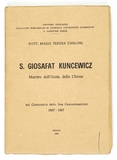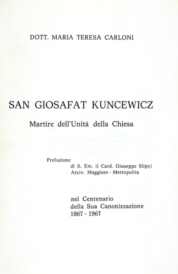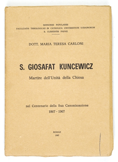 CARLONI Maria Teresa – S. Giosafat Kuncewicz. Martire dell’unità della Chiesa. Nel centenario della sua canonizzazione 1867-1967. . Roma 1969. Scuola Tipografica "Bramante". 16d, s. 270, [1], tabl. barwna 1. brosz. Editionis Populares Facultatis Theologicae in Catholica Universitate Ucrainorum S. Clementis Papae.