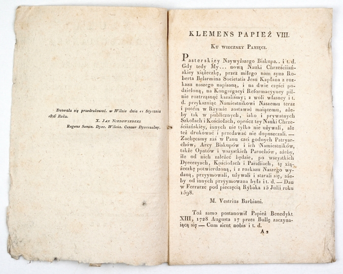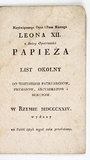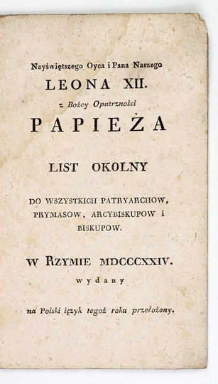 NAYŚWIĘTSZEGO Oyca i Pana Naszego Leona XII. z Bożey Opatrzności papieża List Okolny do wszystkich patryarchow, prymasow, arcybiskupow i biskupow. W Rzymie MDCCCXXIV wydany na polski język tegoż roku przełożony. Rzym 1824. [b.w.]. 16d, s. 26. brosz.