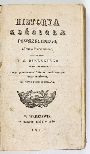 BIELSKI S[zymon] – Historya kościoła powszechnego, z dzieła francuzkiego zebrana przez X. ... dawniej wydana, teraz pomnożona i do naszych czasów doprowadzona, na nowo przedrukowana. Warszawa 1839. Druk. Xięży Piiarów. 16d, s. VIII, 663, [9]. opr. psk. z epoki.