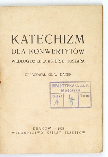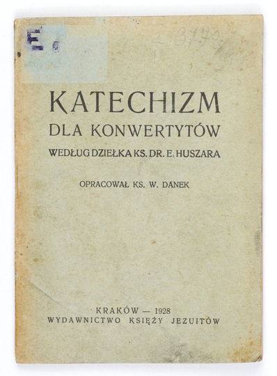 DANEK W[incenty] – Katechizm dla konwertytów. Według dziełka ks. dr. E. Huszara. Oprac. ks. ... Kraków 1928. Wyd. Księży Jezuitów. 16d, s. V, [6]-126, [2]. brosz.