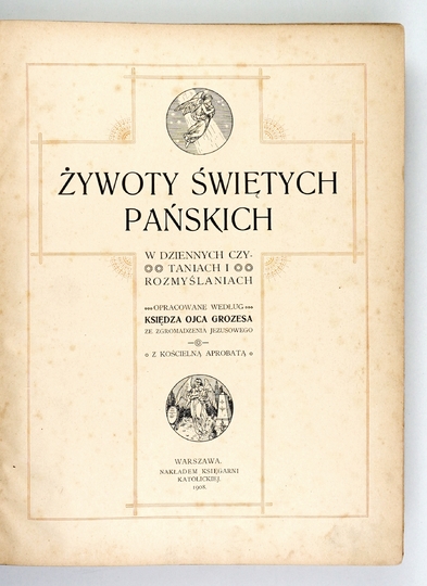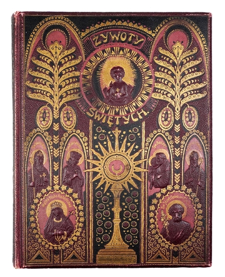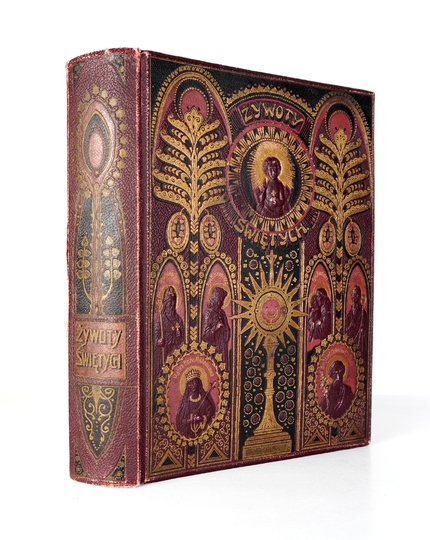 GROZES [Jean Etienne] – Żywoty Świętych Pańskich w dziennych czytaniach i rozmyślaniach. Opracowanie według Księdza Ojca ... ze Zgromadzenia Jezusowego z kościelną aprobatą. Warszawa 1908. Nakł. Księg. Katolickiej. 4, s. [12], IV, 991, XVI, tabl. 17, tabl. barwnych 8 [chromolitografie]. opr. oryg. pł. złoc., zdob.