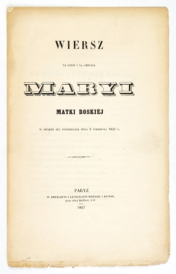 [JEDLIŃSKI Juliusz] – Wiersz na cześć i na chwałę Maryi Matki Boskiej w święto Jej narodzenia dnia 8 września 1847 r. Paryż 1847. Druk. i Litogr. Maulde i Renou. 8, s. 7. brosz.