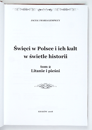 ŁEMPICKI Jacek, ŁEMPICKA Maria – Święci w Polsce i ich kult w świetle historii. T. 1-2. Kraków 2008. Nakł. autorów. Wyd. P. Wietrzykowski. 4, s. 1095, [1]; [1096]-1372. opr. oryg. ppł.