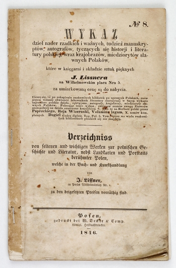 WYKAZ dzieł nader rzadkich i ważnych, tudzież manuskryptów, autografów, tyczących się historji i literatury polskiej, wraz krajobrazów, miedziorytów sławnych Polaków, które w księgarni i składzie sztuk pięknych J[ózefa] Lissnera [...] za umiarkowaną cenę są do nabycia. Poznań 1846. J. Lissner. 16d, s. 75, [1]. brosz.