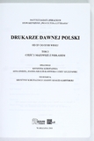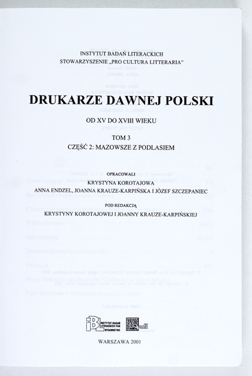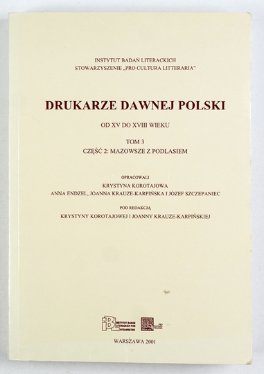 DRUKARZE dawnej Polski od XV do XVIII wieku. T. 3, cz. 2: Mazowsze z Podlasiem. Oprac. Krystyna Korotajowa, Anna Endzel, Joanna Krauze-Karpińska i Józef Szczepaniec. Pod red. K. Korotajowej i J. Krauze-Karpińskiej. Warszawa 2001. PAN, Inst. Badań Literackich, Stow. "Pro Cultura Litteraria". 8, s. XLVIII, [2], 415, [3], ilustr. 25, mapa 1. brosz. Książka w Dawnej Kulturze Polskiej.