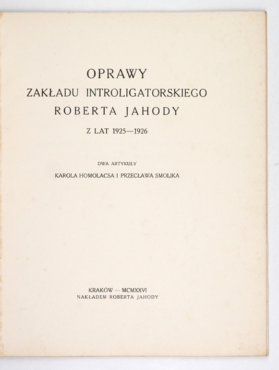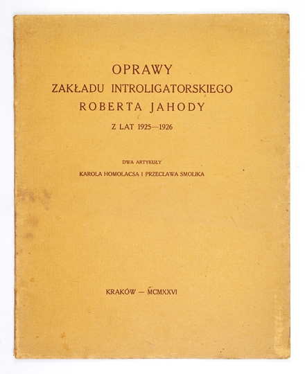 HOMOLACS Karol, SMOLIK Przecław – Oprawy Zakładu Introligatorskiego Roberta Jahody z lat 1925-1926. Dwa artykuły ... Kraków 1926. Nakł. R. Jahody. 4, s. 46, [1]. brosz.