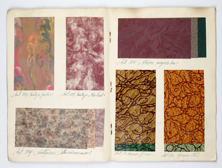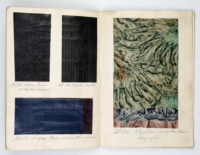 [INTROLIGATORSTWO]. Odręcznie sporządzony wzornik materiałów introligatorskich krakowskiej firmy "Przemysł Introligatorski" z siedzibą przy Placu Szczepańskim 3.